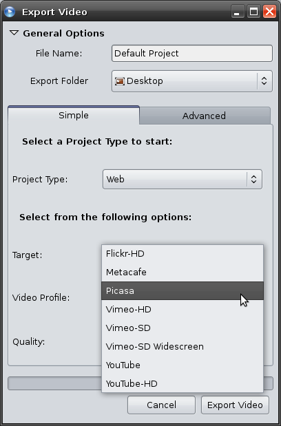 Thanks to the help of lots of readers / contributors, a lot of work from Helen and Andy, we now have a "simple" way to choose export options. Before, you had to know all the specifics of a format, codec, supported bit rate, etc... Now you just have to click a few drop-downs and boom... you have a video! =)